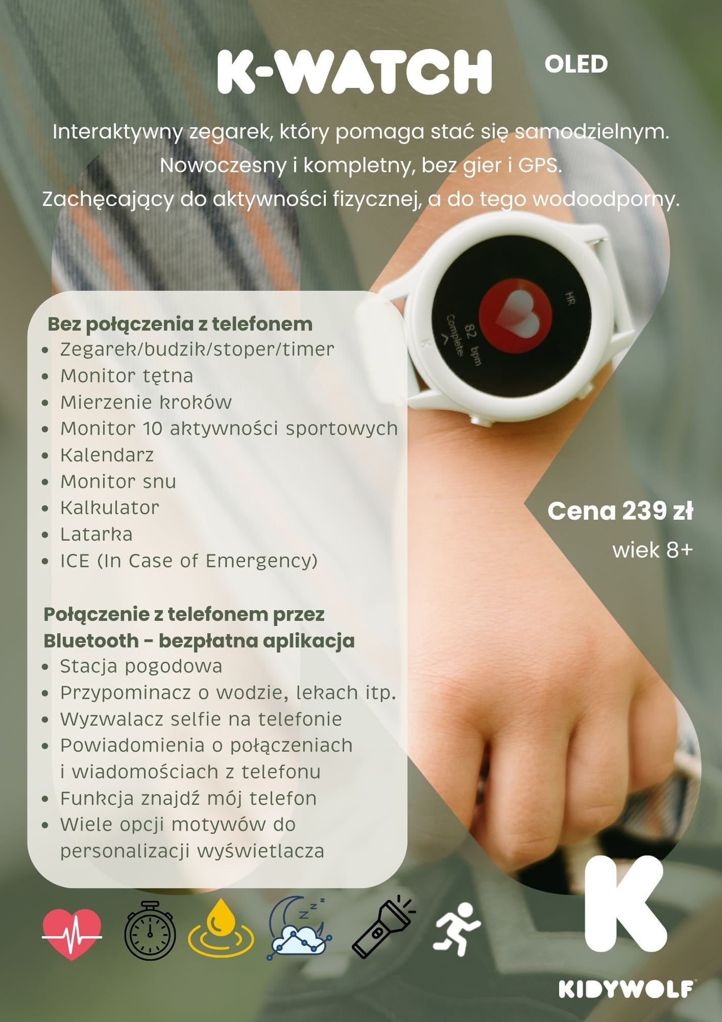 K-Watch jest nowoczesny, bezpieczny i pełen praktycznych funkcji, które pomagają im być aktywnymi, zorganizowanymi i bardziej samodzielnymi. Smartwatch specjalnie nie jest wyposażony w gry, aby dzieci, które go używają nie uzależniały się od zabawy na ekranie. Dzięki nowoczesnemu designowi, kolorowemu ekranowi dotykowemu OLED i 10 trybom sportowym, K-Watch motywuje dzieci do ruchu i zabawy w zdrowym stylu. Wbudowany alarm, timer, stoper i latarka sprawiają, że to nie tylko gadżet, ale codzienny towarzysz nauki, zabawy i przygód.