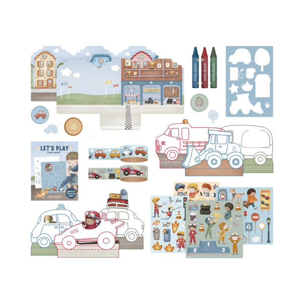 - kolorowe kartonowe arkusze z motywem samochodów, ciężarówek, wyścigówek,