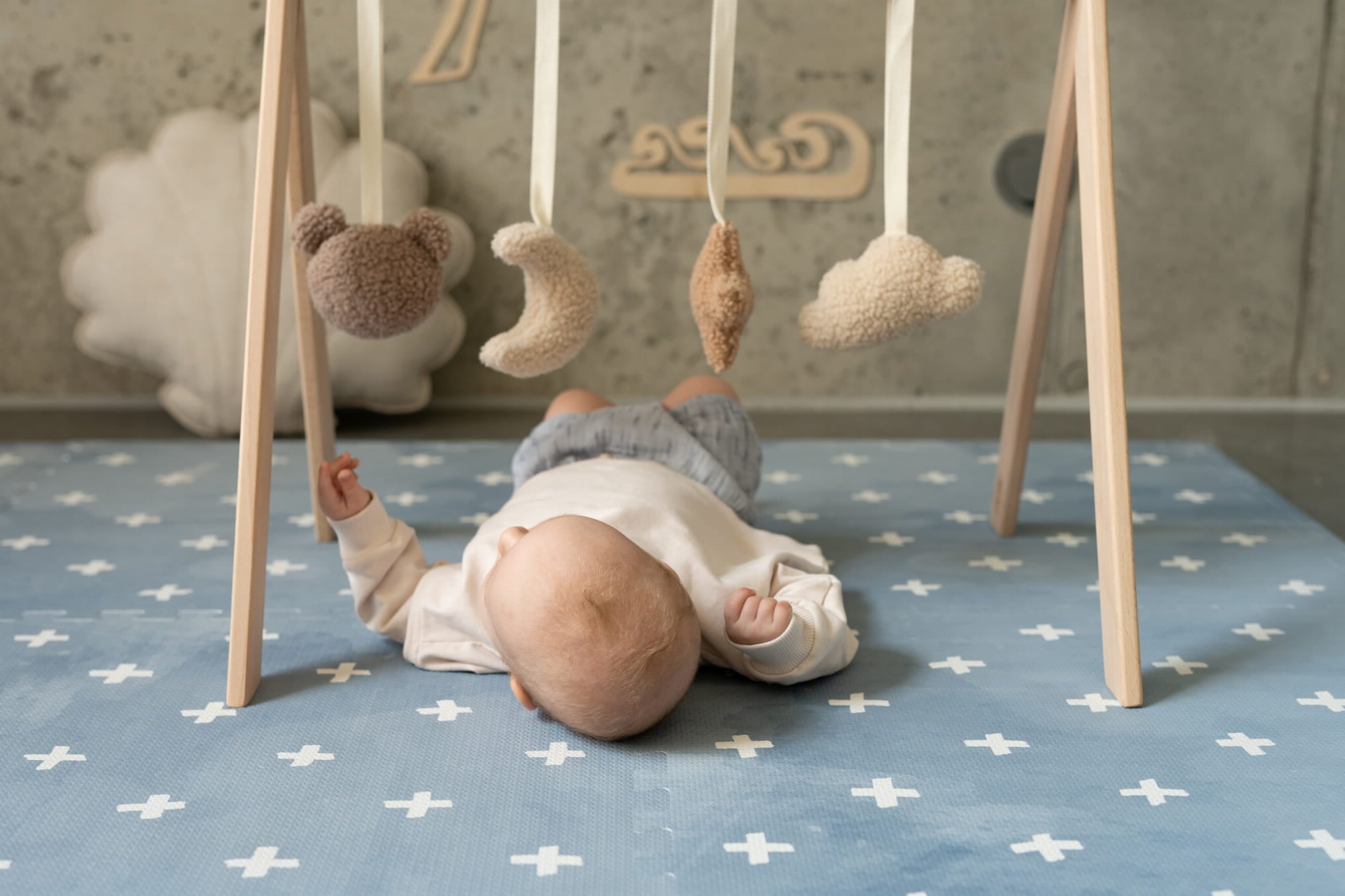 to połączenie funkcjonalności, stylu i bezpieczeństwa. Niebieski, morski odcień z minimalistycznym wzorem krzyżyków w stylu boho sprawia, że mata prezentuje się elegancko i pasuje zarówno do pokoju dziecka, salonu, jak i kącika zabaw. Wygląda jak nowoczesny dywan, a jednocześnie zapewnia dziecku bezpieczną i komfortową przestrzeń do codziennej aktywności.