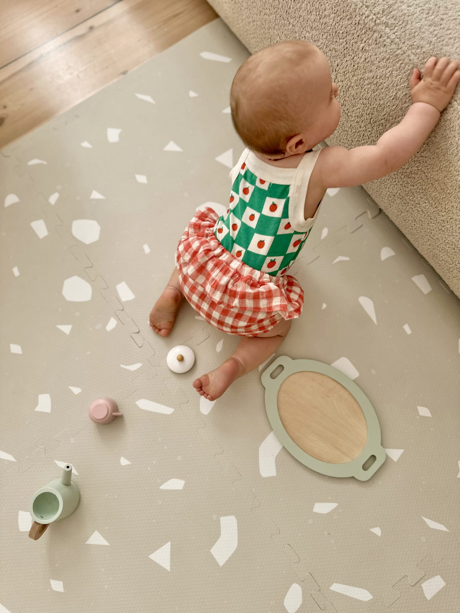 Mata piankowa puzzle TERRAZZO TAUPE Olya Kids to idealny wybór dla rodziców, którzy chcą połączyć funkcjonalność, bezpieczeństwo i estetykę – bez kompromisów dla wnętrza.