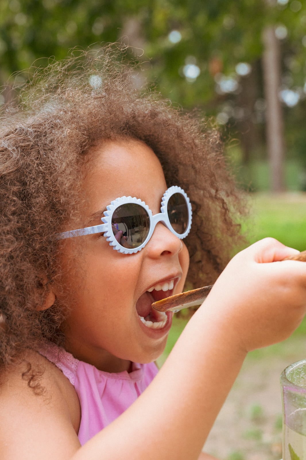 Ultralekkie okulary przeciwsłoneczne Fleur wyróżniają się okrągłymi soczewkami typu panto, subtelnymi detalami w kształcie płatków kwiatów oraz lustrzanymi soczewkami z poliwęglanu. W 100% wyprodukowane we Francji (region Ain), dostępne w kilku wariantach kolorystycznych. Zaprojektowane tak, aby towarzyszyć dzieciom w wieku od 0 do 4 lat (0–1, 1–2, 2–4 lata) podczas codziennych odkryć – na spacerze, placu zabaw czy wakacjach.