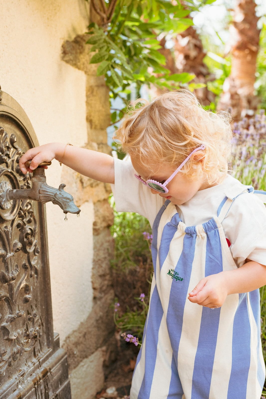 Ultralekkie okulary przeciwsłoneczne Fleur wyróżniają się okrągłymi soczewkami typu panto, subtelnymi detalami w kształcie płatków kwiatów oraz lustrzanymi soczewkami z poliwęglanu. W 100% wyprodukowane we Francji (region Ain), dostępne w kilku wariantach kolorystycznych. Zaprojektowane tak, aby towarzyszyć dzieciom w wieku od 0 do 4 lat (0–1, 1–2, 2–4 lata) podczas codziennych odkryć – na spacerze, placu zabaw czy wakacjach.