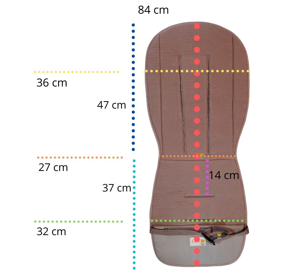 - rozmiar wkładki i otwory na pasy 5-cio punktowe przystosowane do trendów producentów wózków: pasy naramienne i bioderkowe przechodzą przez 1 długi otwór wzmocniony rzepem dwustronnym, 2 poziomy na pas krokowy