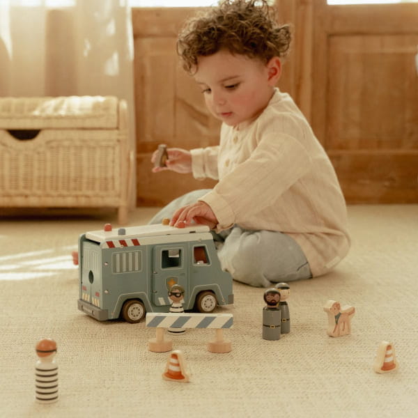 Samochód policyjny z figurkami od Little Dutch wyróżnia piękna, delikatna kolorystyka.