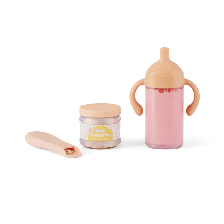 Zestaw urodzinowy dla lalek od australijskiej marki Tiny Harlow. Daj lali pić ze specjalnego kubka-niekapka i nakarm ją łyżeczką – w słoiczku czeka deserek Tiny Tummies o smaku magicznego, urodzinowego tortu! Mleko truskawkowe magicznie znika, kiedy przechylasz kubek – jakby lala faktycznie piła! ?? Do słoiczka z deserkiem dołączona jest specjalna łyżeczka – kiedy przykłada się ją lali do ust, wygląda, jakby naprawdę jadła. Miła niespodzianka: nakrętka słoiczka pachnie jak prawdziwy tort urodzinowy.